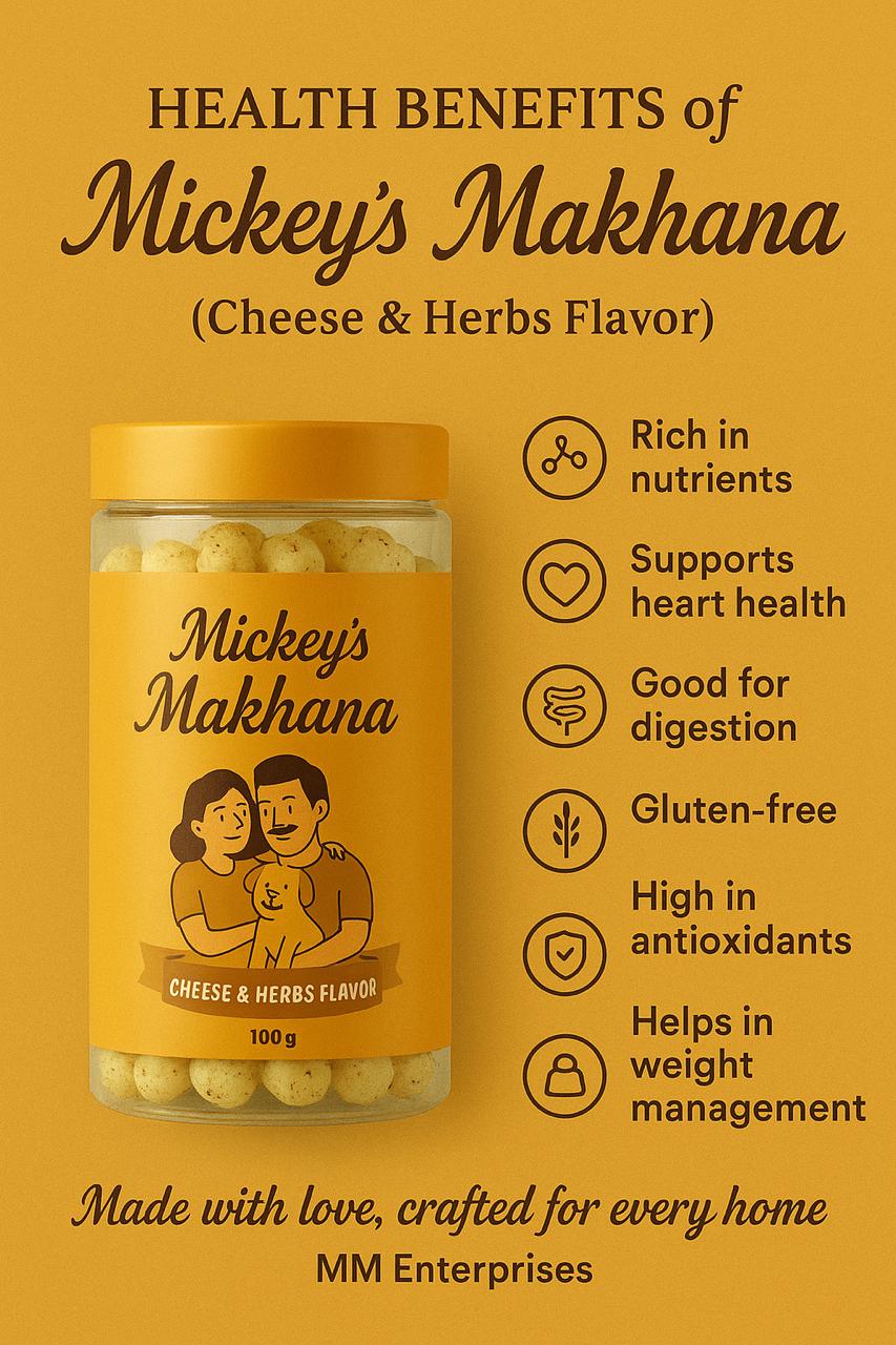 Indulge in the creamy, cheesy flavor of Cheese & Herbs Makhana, a perfect mix of herbal aroma and cheesy delight. Loved by kids and adults alike!
